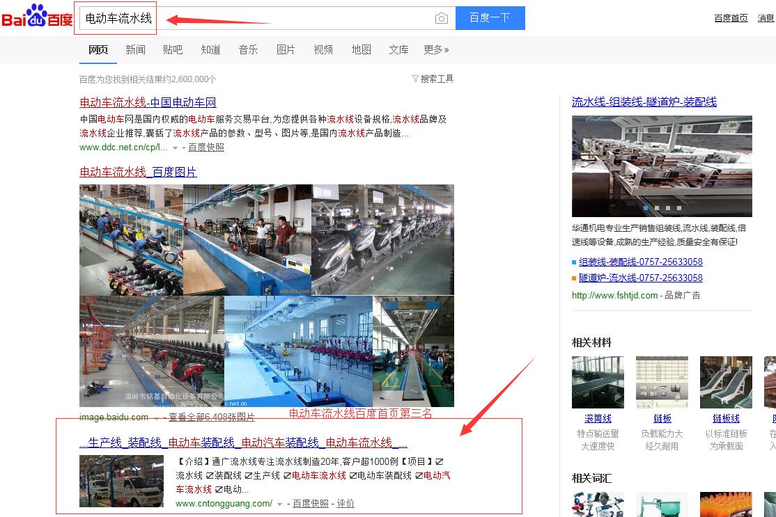 “電動車裝配線”百度首頁第一名,請看下方截圖 ,“電動車流水線”,“電動汽車流水線”,“電動汽車裝配線”,等等,很多關鍵詞都在百度首頁,請看如下截圖,有圖為證。在此特意感謝臺州SEO(通盛網絡)人員為我公司網站所做的付出與努力